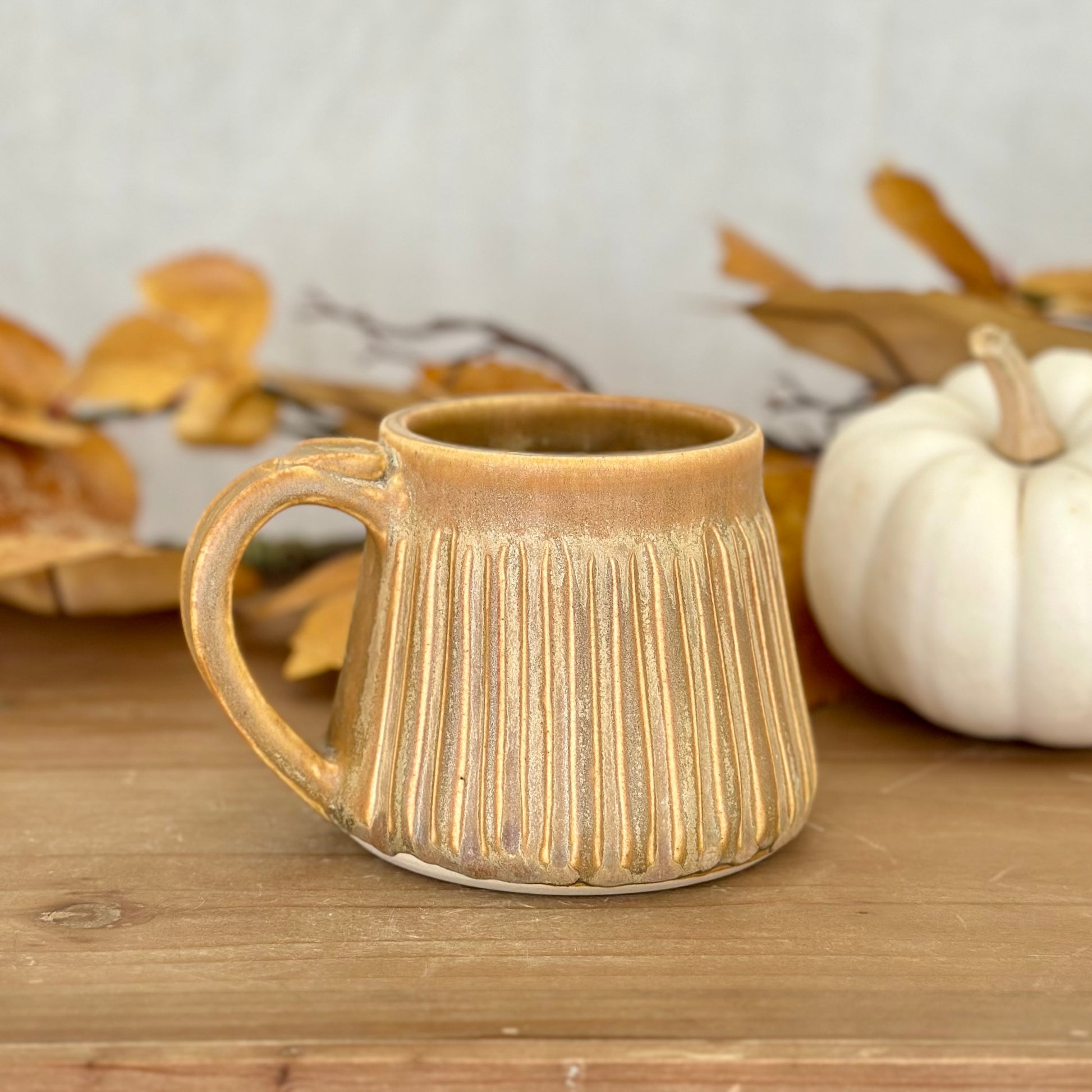 Immerse yourself in Autumn with this beautiful ceramic mug in a stunning, rich golden glaze. The hand-carved ridges not only provide a unique, tactile grip but also make this an absolute statement piece for savoring your coziest fall drinks.