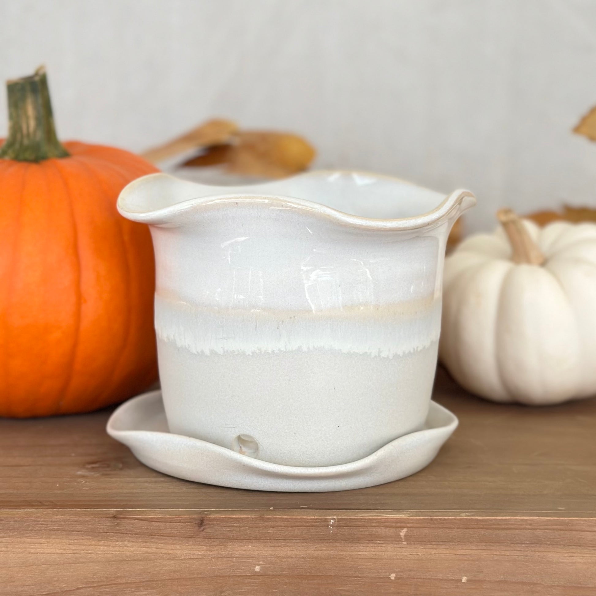 Display your favorite plant in this ceramic planter, featuring a beautiful, flowing white glaze and a gently waved rim for an organic, handcrafted look. The included matching drip plate ensures your surfaces stay clean, making this functional yet elegant piece a perfect home for any plant.