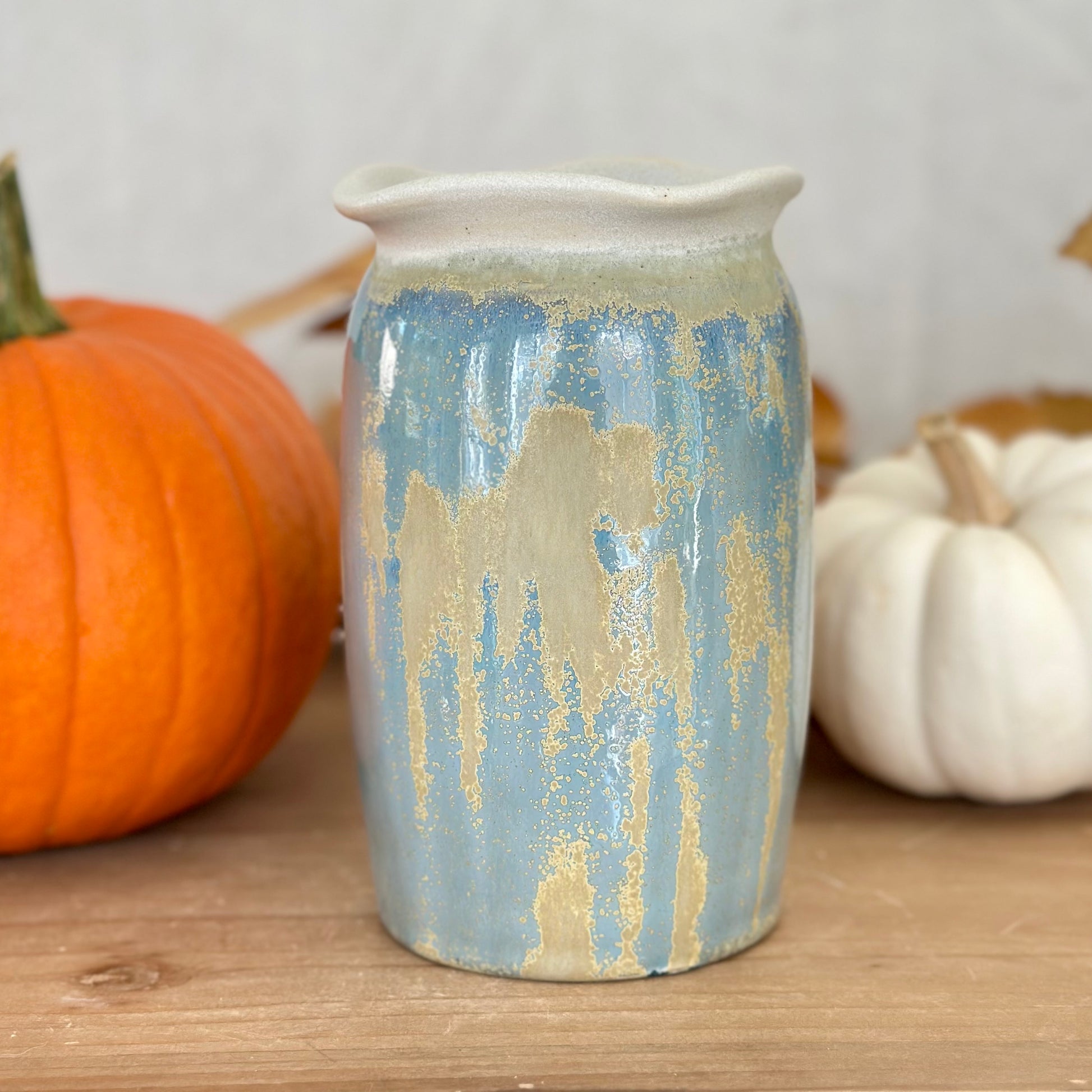 Evoke the tranquility of a coastal scene with this captivating ceramic vase, featuring a serene sky-blue glaze dramatically interrupted by cascading vertical drips of sandy beige. The organic, wavy rim and striking color contrast create an eye-catching, artisanal piece that effortlessly elevates any floral arrangement.